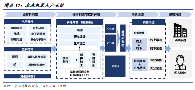 中资品牌凭借技术创新及供应链优势崛起。泳池机器人产业链可拆解为原材料供应、硬件制造与软件开发、销售渠道和终端消费四个部分。其中,硬件制造与软件开发环节是决定产品核心性能的关键。
