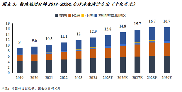 全球泳池规模稳健增长,带动清洁支出增加。2024年全球泳池总数约为3290万个,预计到2029年将进一步增加至3930万个,CAGR为3.6%。泳池清洁支出从2019年的90亿美元增长至2024年的129亿美元,预计至2029年规模将达到167亿美元。