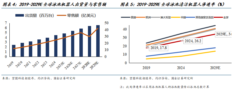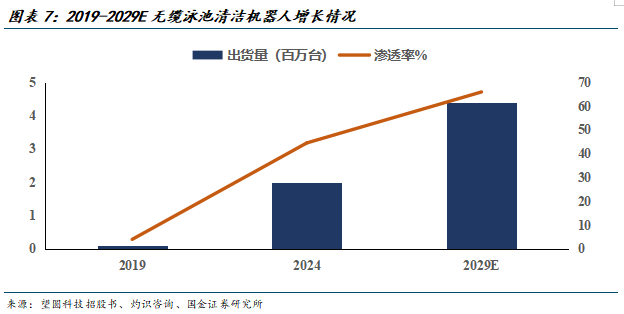 目前渗透率仅26%,提升空间充足。据灼识咨询,2024年泳池机器人渗透率仅为26.2%(此处以采用泳池机器人的泳池数量除以泳池总数计算),对于抽吸式设备、压力式设备、手动清洁方式等存在充分的替代空间,2029年渗透率有望提升至34.2%。