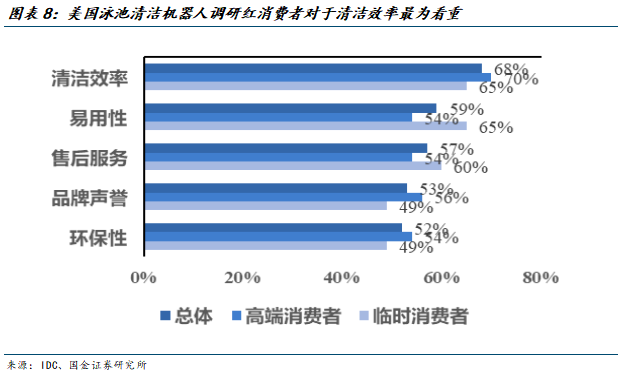根据IDC发起的美国泳池清洁机器人调研,产品的清洁效率是核心决策因子,易用性与售后服务是区分客群的关键指标,高端消费者更愿意为售后体系、消费体验、品牌保证支付更多的溢价。