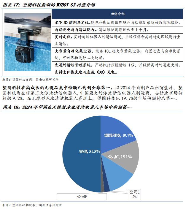 1)以望圆科技、元鼎智能为代表的泳池机器人头部专业品牌,其中星迈创新等企业作为赛道新势力,凭借差异化的产品同样占据一定市场份额;