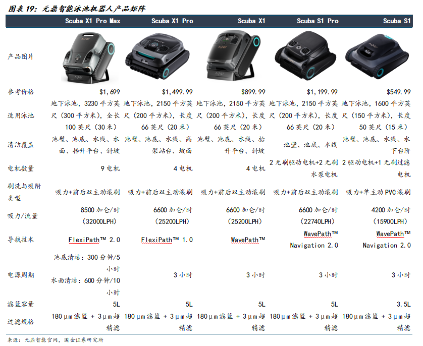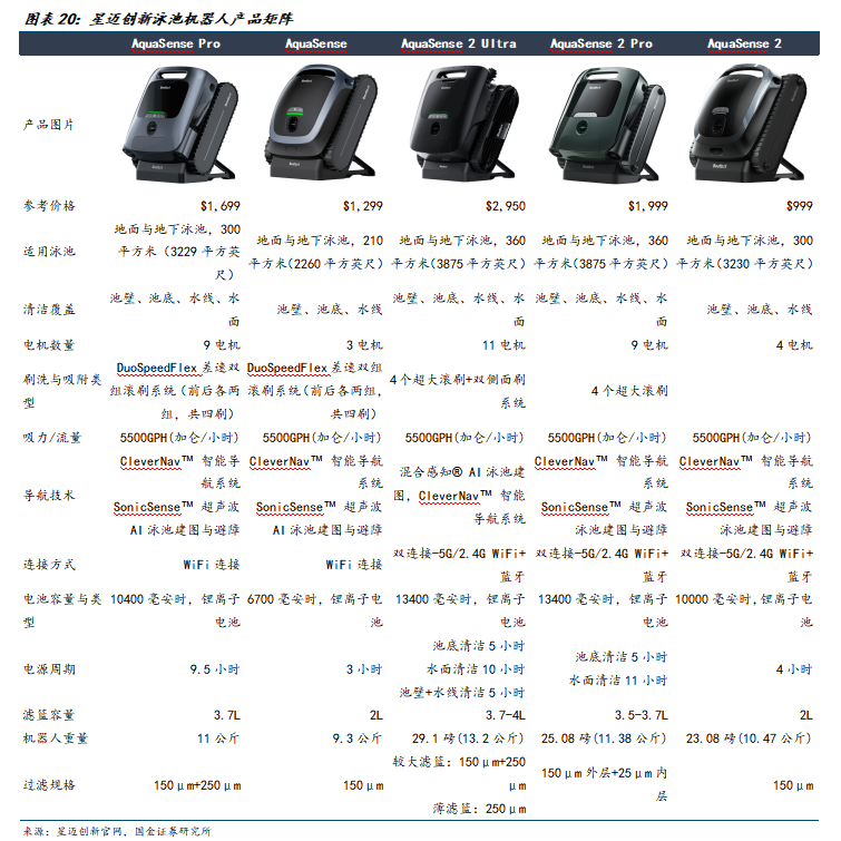 公司产品线聚焦高端市场,主打AquaSense系列。2024年2月推出的第一代产品AquaSense Pro及AquaSense售价分别为2199美元和1299美元,半年内实现数亿元销售额。2025年1月,公司发布全球首款AI驱动的五合一泳池机器人AquaSense 2 Ultra,在硬件架构与软件系统方面都实现了迭代升级,比如在硬件架构方面,AquaSense 2 Ultra搭载了包括AI摄像头、红外、超声波、水深与水温传感器等共27组高精度传感器,具备全方位的环境感知能力。软件与算法层面,AquaSense 2 Ultra依托于四核处理器和自研的AI视觉融合建图系统,可以实现地图构建与智能路径规划等。